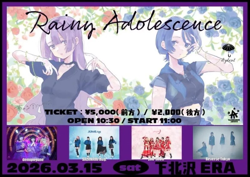 ■イベント概要 「Rainy Adolescence」 日程|3/15(日) 会場|下北沢ERA 料金|S ¥5,000(前方)/A¥2,000(後方) 出演|il pleut/夢みるアドレセンス/SAZANAMi Λug./demipogune/you-show/Reverse Tokyo