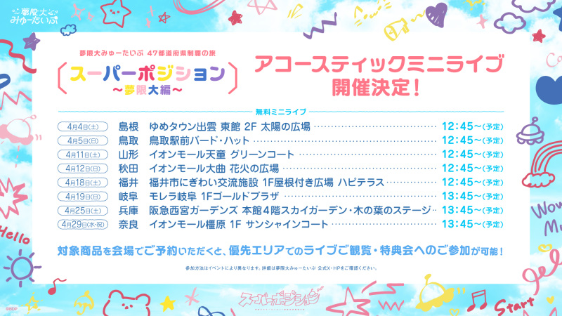 夢限大みゅーたいぷ 47都道府県制覇の旅「スーパーポジション 〜夢限大編〜」として アコースティックミニライブ (観覧フリー)を実施いたします! また、2026年5月13日(水) リリース 夢限大みゅーたいぷ 4th Single「超惑星Xへの旅」予約購入者を対象とした「アコースティックミニライブ優先エリア観覧」、「広がれ!ゆめみたの輪!〜お見送り撮影編~」、「特典お渡し会」の開催が決定しました!