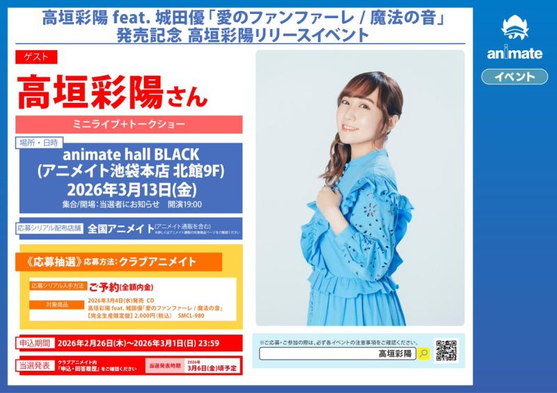 ミニライブ+トークショー。期間中、対象商品を全国アニメイトにて、ご予約(全額内金)頂いたお客様に応募シリアルをお渡しします。