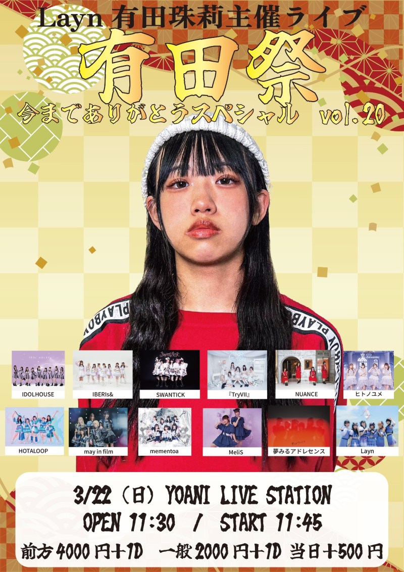 3月22日 (日) Layn有田珠莉主催ライブ 「有田祭 vol.20 〜今までありがとうスペシャル〜」 ◽️YOANI LIVE STATION OPEN 11:30 / START 11:45 前方 ¥4,000 / 一般 ¥2,000 / 当日 +¥500(各+1D代) 【出演】 IDOLHOUSE / IBERIs& / SWANTICK /『TryVll』/ NUANCE / ヒトノユメ . / HOTALOOP / may in film / mementoa / MeliS / 夢みるアドレセンス / Layn / 二色真鈴(ex.Layn) / 有田珠莉(Layn) 【注意事項】 ・チケット購入確定後、お客様のご都合によるチケットのキャンセル・払い戻しは受け付けておりません。 ・出演者の変更、キャンセルに伴う払い戻しは一切致しません。 ・モッシュ、ダイブ、リフトその他危険行為は一切禁止とさせて頂きます。 ・荷物を置いての場所取り、1人で複数のスペースを確保する行為は禁止です。 ・泥酔者の入場不可。 ・LIVE中の録画録音撮影は禁止とさせて頂きます。撮影OKのグループは各運営様のルールをご確認ください) ・飲食の持ち込み禁止 上記のルールをお守りになれない場合、ご退場して頂く場合がございます。予めご了承ください。
