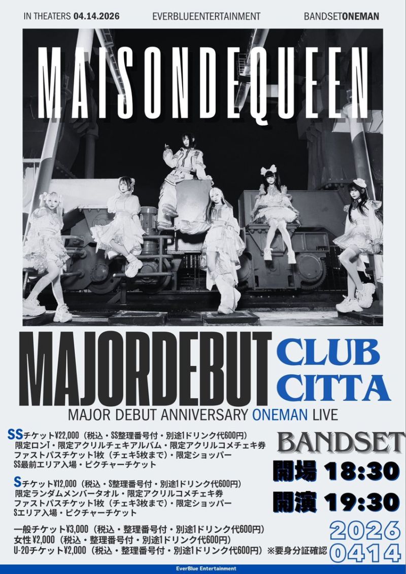 Maison de Queenメジャーデビューします。私達Maison de Queenは2026年4月14日(火)CLUB CITTAで開催される新体制1周年記念ONE MAN LIVEにてメジャーデビューいたします。