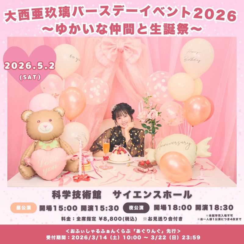 大西亜玖璃のバースデーイベント。おふぃしゃるふぁんくらぶ「あぐりんぐ」先行受付も実施。