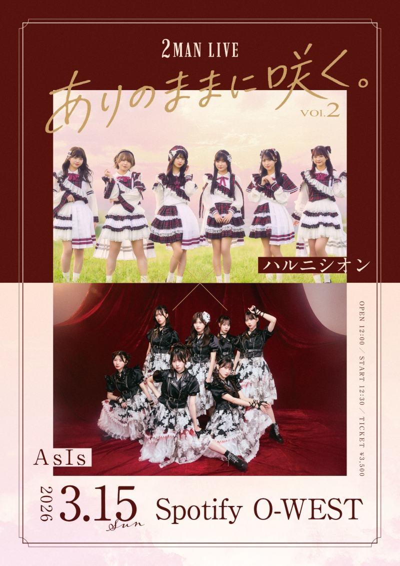 2MAN LIVE ありのままに咲く。vol2 日程 | 2026年3月15日(日) 時間 | OPEN12:00 / START12:30 会場 | Spotify O-WEST 料金 | 前売¥3,500 ※別途1D代 出演 | ハルニシオン / AsIs ※入場順:整理番号順 【注意事項】 ・迷惑・危険行為一切禁止/整理番号順入場 ・未就学児入場不可 。ドリンク別途必要 ・再入場不可/チケットの再発行不可/チケット半券切り離し無効・入場不可 ・ライブ当日は、係員の誘導・指示に従ってください。 ・アルコールの持ち込み及び、飲酒をしてのご入場は禁止致します。 ・開場/開演時間の変更、メンバーの体調不良やスケジュールの都合等の理由により、不参加または変更になった場合もチケットは返金できませんので、予めご了承ください。 ・入場時及びチケット購入時にご登録いただいたお名前、ご連絡先を、政府の要請に基づき保健所等の公共機関へ提供させていただく可能性がございます。 ・公演中のリフト、ダイブサーフ、過度なモッシュ、横移動等禁止 ・その他、運営側の判断で、他のお客様、イベント側、運営側に迷惑をかける行為。 ・客席を含む会場の映像・写真が公開される場合がございます。予めご理解の上、ご来場ください。 ・天災時等、止むを得ない都合により急遽イベント内容変更や中止となる場合がございます。予めご了承ください。その際のチケットの払戻し等は致しませんので予めご了承下さい。 また本イベントの中止に伴う会場までの旅費等(キャンセル料)の保障は一切致しません。 ・会場内・会場付近では係員の指示に従っていただきますようご協力をお願い致します。施設近隣、他の来場者の迷惑になる行為を行う等の場合入場をお断りする場合もございますので予めご了承ください。 その際のチケットの払い戻しは一切行いません。