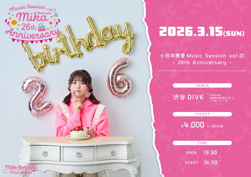 ※こちらは昼の部のチケット受付サイトとなります。 夜の部『小日向美香 Music Session vol.1 -はじまりの音-』のチケットをお求めの方は https://tiget.net/events/452555 をご参照ください。 ※1次先行抽選受付は2026/01/05 11:59(JST)までとなります、2次および一般発売に関しては1次で完売の場合は実施いたしません。 PHOTO BY:つるたけんご https://www.instagram.com/studiokacet