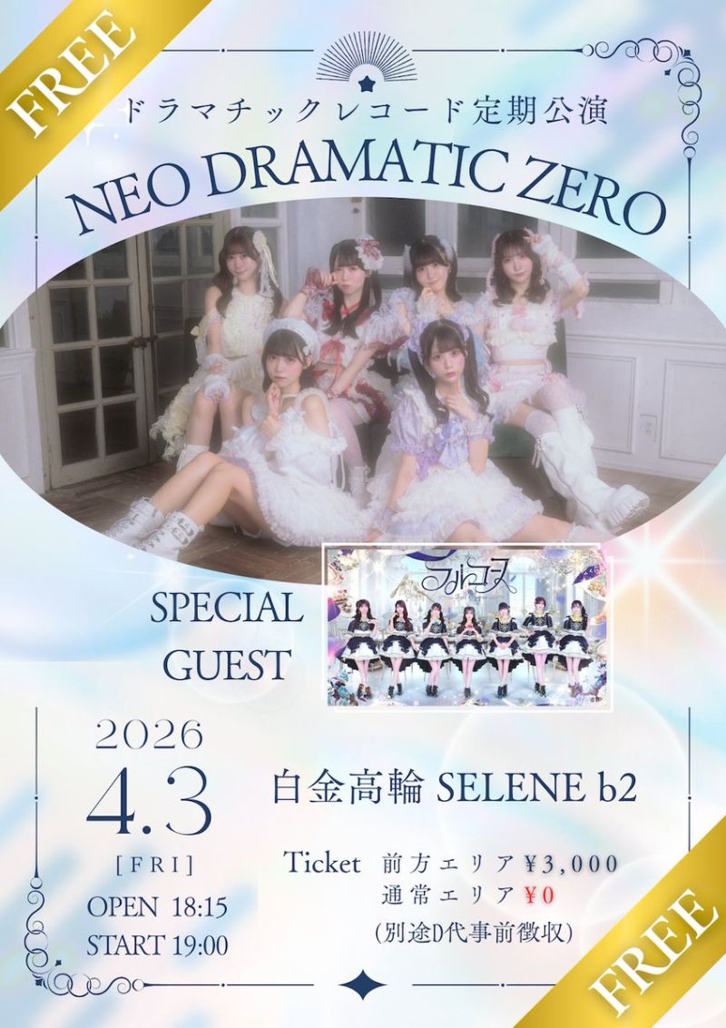この日はNEO DRAMATIC ZEROを開催🎊 そして今回はスペシャルゲストに #フルコース ( @FullCourse_idol )さんをお呼びした特別無銭公演✨ 白金高輪SELENE b2を最高に盛り上げます❤️🔥 たくさんのご来場お持ちしております🎬