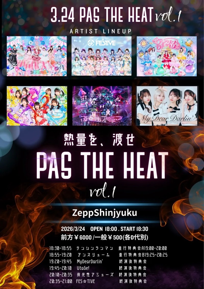3月24日(火)【PAS THE HEAT】 ◆会場:ZeppShinjuku ◆時間:18:00 OPEN / 18:30 START ◆料金:前方¥6,000 / 一般¥500(各D代別) ◆出演:FES☆TIVE ◆GUEST:夜光性アミューズ / UtaGe! / アンスリューム / MyDearDarlin' / テンシンランマン
