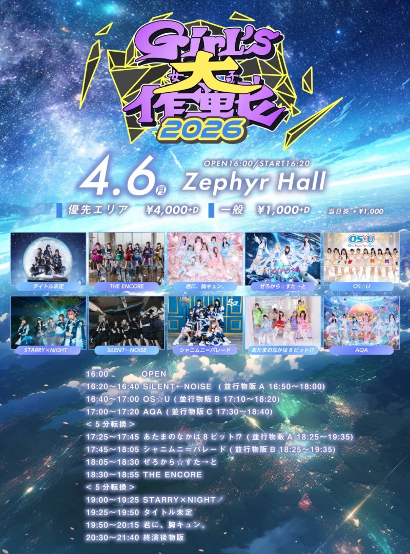 【表題】Girl's大作戦 【日程】4月6日月曜日 【会場】Zephyr Hall 【時間】open16:00/START16:20 【チケット】優先エリア¥4000/一般¥1000/当日券+¥1000/+1D 【出演】 タイトル未定 THE ENCORE 君に、胸キュン ぜろから☆すた→と STARRY×NIGHT↗︎ SiLENT←NOiSE シャニムニ=パレード あたまのなかは8ビット⁉︎ OS☆U 追加 AQA 追加 【タイムテーブル】 OPEN16:00/START16:20 16:20〜16:40 SiLENT←NOiSE 並行物販A 16:50〜18:00 16:40〜17:00 OS☆U 並行物販B 17:10〜18:20 17:00〜17:20 AQA 並行物販C 17:30〜18:40 5分転換 17:25〜17:45 あたまのなかは8ビット⁉︎ 並行物販A 18:25〜19:35 17:45〜18:05 シャニムニ=パレード 並行物販B 18:25〜19:35 18:05〜18:30 ぜろから☆すた→と 18:30〜18:55 THE ENCORE 5分転換 19:00〜19:25 STARRY×NIGHT↗︎ 19:25〜19:50 タイトル未定 19:50〜20:15 君に、胸キュン 20:30〜21:40 終演後物販 【開催における注意事項】 ・スタッフの指示に従っていただけない方は退場いただくことがございます。その際のチケットの払い戻しは致しませんのであらかじめご了承ください。 ・モッシュ、ダイブ、リフト他危険行為は禁止とさせて頂きます。そのような行為によりケガ・事故等発生した場合は当事者同士で協議を頂き、主催者は関与致しかねます。 ・過度な場所取り行為はご遠慮ください。 ・お手荷物はロッカーをご利用ください。 ・ご購入者様、ご本人様のご来場をしていただきますようにお願い致します。 ・公演終了後、会場を出られた方は溜まらずに解散をお願い致します。 ・出待ち、入り待ち等、近隣の方の迷惑になる行為はお辞め下さい。 お問い合わせ: 株式会社GMG Entertainment([email protected])