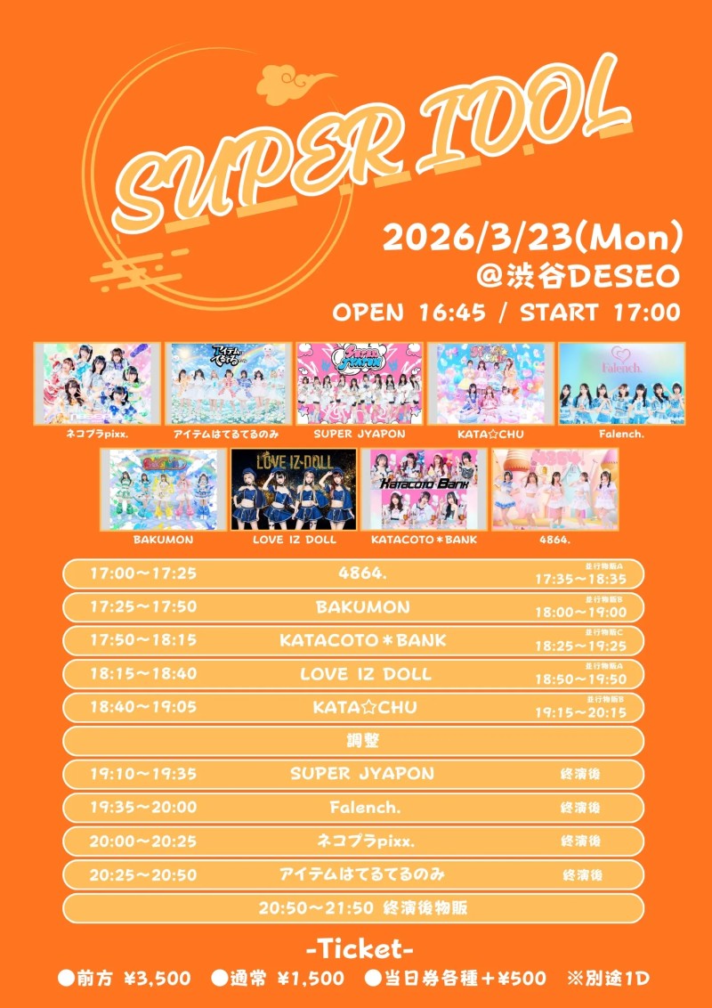 前方チケット¥3,500整理番号順入場1ドリンク別6歳以上チケット必要