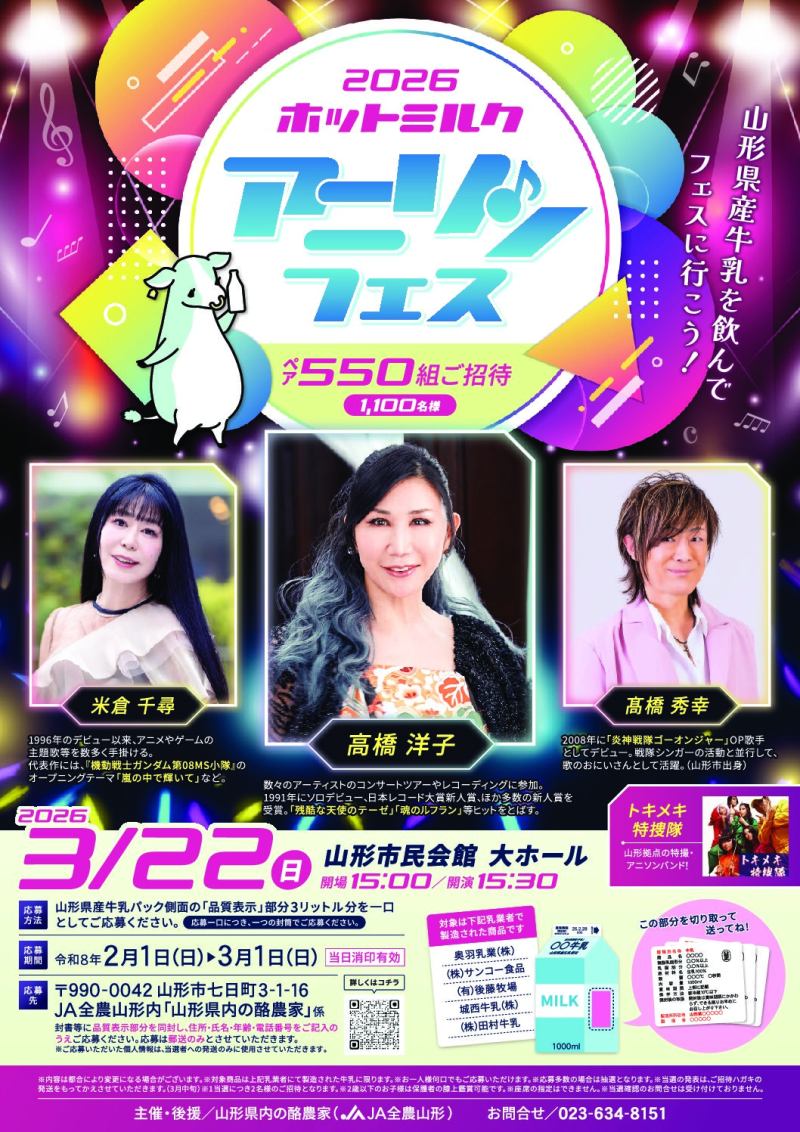 山形県産牛乳消費拡大キャンペーン! 冬は生乳の生産が増える一方、毎年、牛乳消費量の減少が懸念されています。 山形県産牛乳の消費拡大を目指して、山形県内の酪農家(事務局:JA全農山形)では、応募者の中から、抽選で計550組(総1,100名)をアニソンフェスへご招待します!
