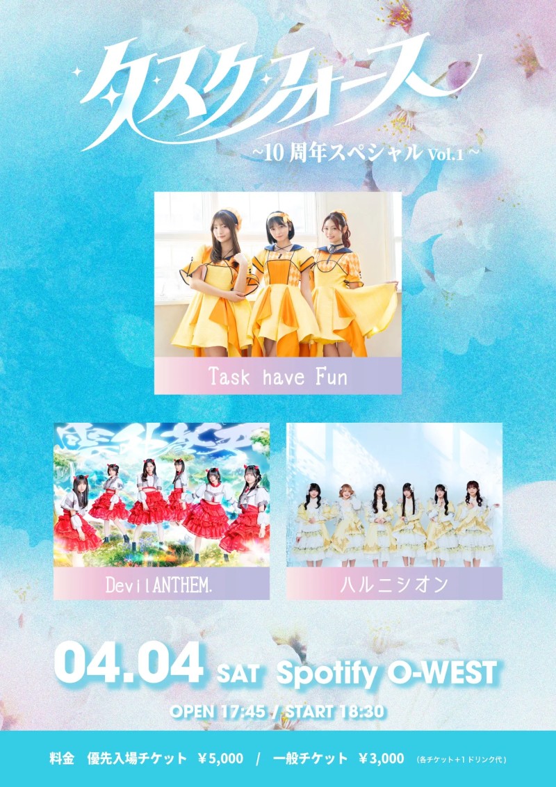 タスクフォース -10周年スペシャル Vol.1-。注意事項:柵に登る行為、リフト・ダイブ等の行為は禁止です。極端に光量のあるペンライト、サイズの大きいペンライトは使用不可。許可のない撮影・録画・録音等は禁止。会場内外で発生した事故、事件、盗難、紛失、負傷等について、主催者、会場、アーティストは一切責任を負いません。