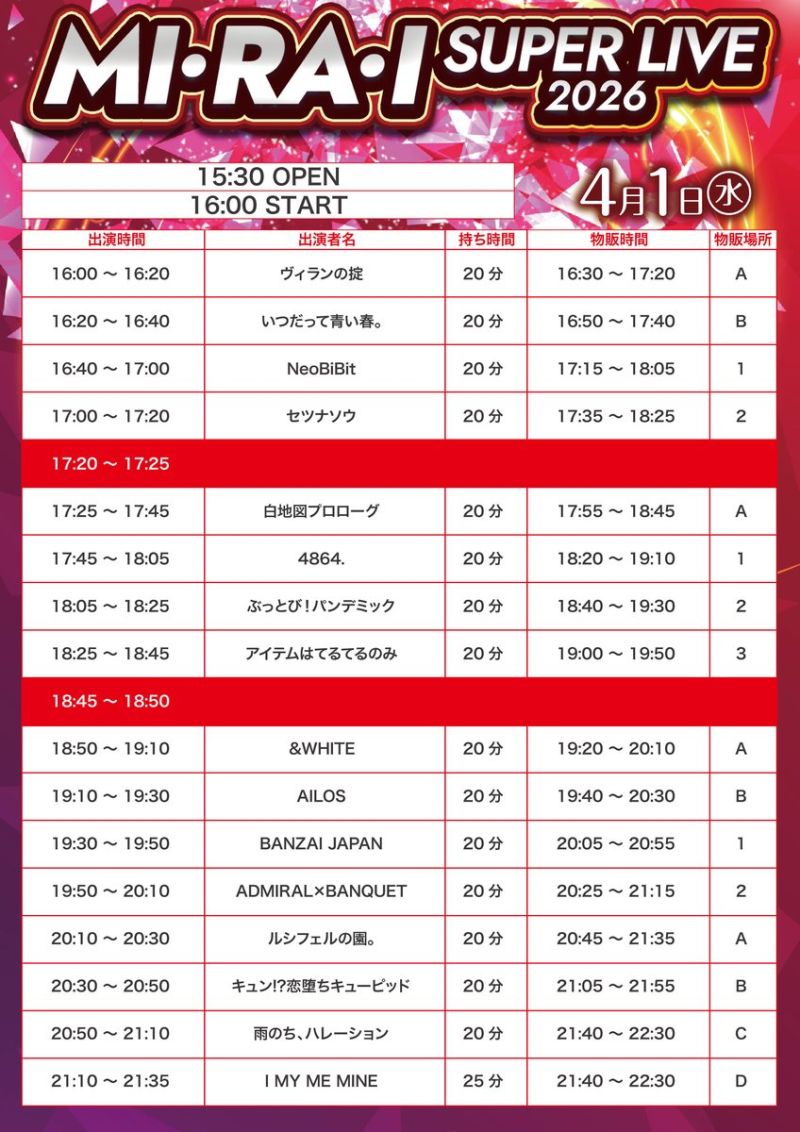 | 16:00~16:20 | ヴィランの掟 特典会時間: 16:30~17:20 |