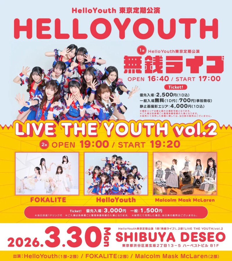 優先入場¥3,000整理番号順入場、1ドリンク別、6歳以上チケット必要