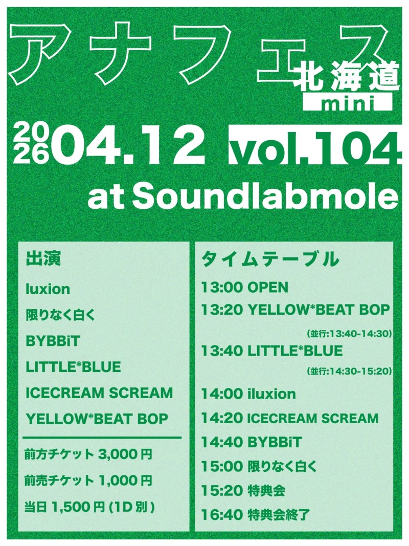 前方チケット¥3,000整理番号順入場1ドリンク別6歳以上チケット必要