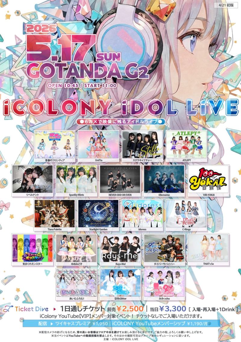 ▶タイムテーブル ※決まり次第こちらに記載します ※1つのチケットで1日入退場可能。(入場・再入場 1Drink) ※TicketDiveでの販売は前日23:59まで。以降当日券(+¥1,000)となります。 ※iCOLONY YouTubeVIPメンバー対象イベント! iCOLONY YouTubeVIPメンバーの方はドリンク代のみでご入場いただけます。 ※当イベントはYouTubeへの動画の掲載を禁止します。そのほかの撮影可否は、グループ毎のレギュレーションに従います。 ※お客様都合によるチケット代の返金・払戻には応じておりません。