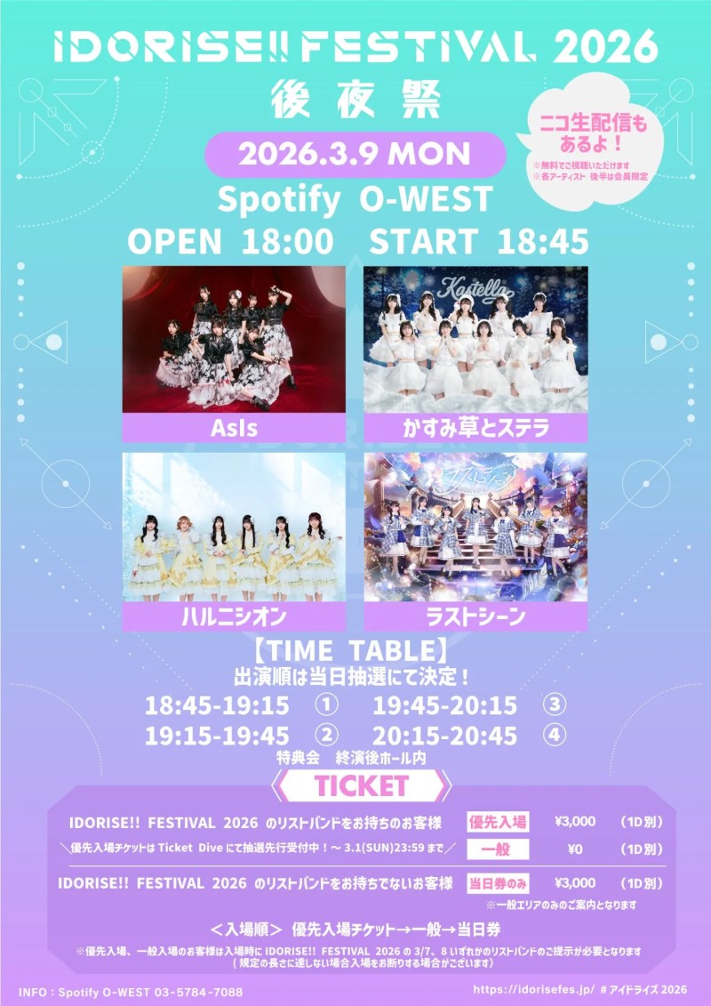 ★IDORISE!! FESTIVAL 2026のリストバンドをお持ちのお客様 →優先入場チケットご希望のお客様はこちらのページからご購入ください。 →一般につきましてはチケットの購入は不要です。IDORISE!! FESTIVAL 2026のリストバンドをお持ちになり、当日直接会場までお越しください。 ★IDORISE!! FESTIVAL 2026のリストバンドをお持ちでないお客様 →当日券のみのご案内となります。当日直接会場までお越しください。 <入場順> 優先入場チケット(整理番号順)→ 一般(整列順) → 当日券 【注意事項】 ※公演・出演者等の詳細・各注意事項はオフィシャルHPよりご確認の上、了承のもとご来場下さい。 ※開場/開演時間、及び出演者は変更になる場合がございます。また、その際の払い戻しは致しかねます。 ※優先入場、一般入場のお客様は入場時にIDORISE!! FESTIVAL 2026の3/7、8いずれかのリストバンドのご提示が必要となります (規定の長さに達しない場合入場をお断りする場合がございます) ※優先入場チケットの券売状況によっては一般入場をお断りさせていただく場合がございます。 ※再入場不可 ※営利⽬的の転売禁⽌。 ※3歳未満⼊場不可 ※アルコール類の持ち込み、及び飲酒しての⼊場はお断り致します。