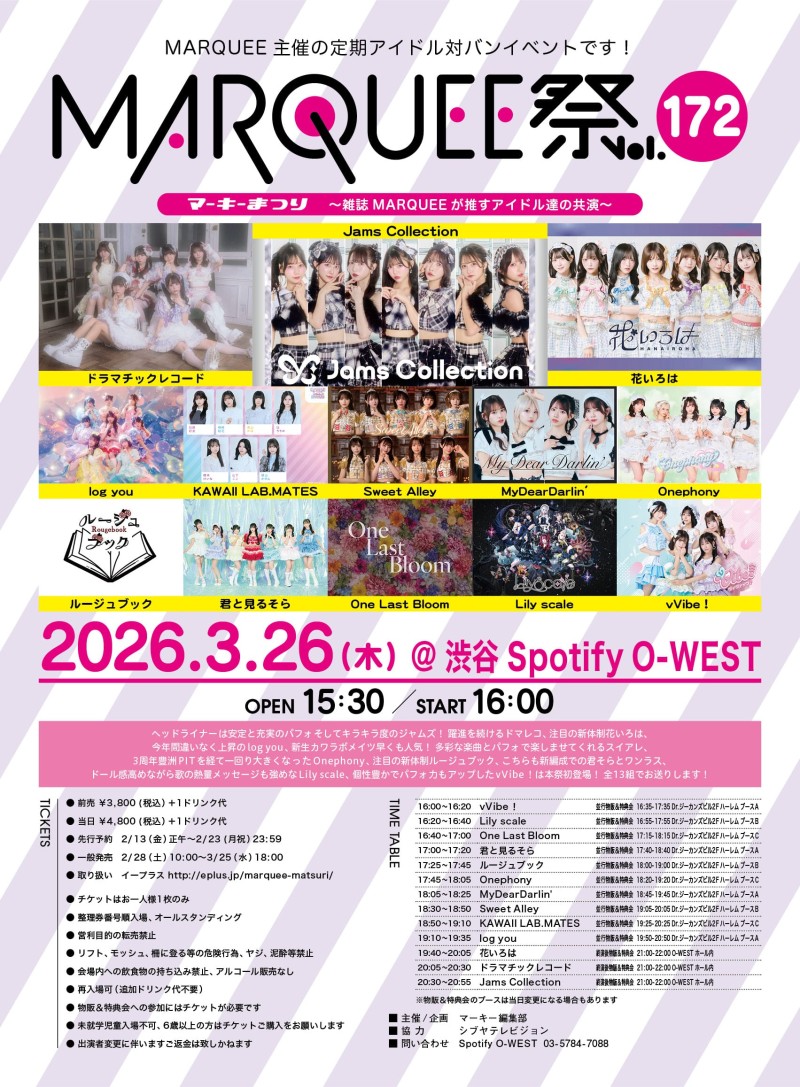 MARQUEE主催の定期アイドル対バンイベントです!~雑誌MARQUEEが推すアイドル達の共演~ ヘッドライナーは安定と充実のパフォそしてキラキラ度のジャムズ!躍進を続けるドマレコ、注目の新体制花いろは、今年間違いなく上昇のlog you、新生カワラボメイツ早くも人気!多彩な楽曲とパフォで楽しませてくれるスイアレ、3周年豊洲PITを経て一回り大きくなったOnephony、注目の新体制ルージュブック、こちらも新編成での君そらとワンラス、ドール感高めながら歌の熱量メッセージも強めなLily scale、個性豊かでパフォ力もアップしたvVibe!は本祭初登場!全13組でお送りします!