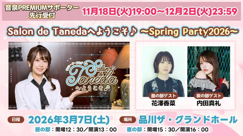 種田梨沙さんの番組イベント「Salon de Tanedaへようこそ♪ ~Spring Party2026~」の開催が決定しました。夜の部にはゲストとして内田真礼さんをお迎えします。