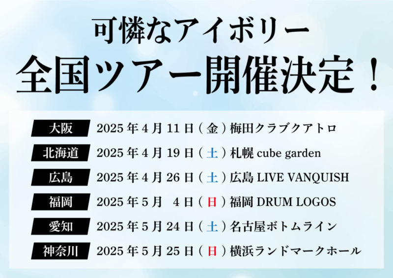 可憐なアイボリー 全国ツアー の開催が決定しました!詳細は後日発表!お楽しみに!