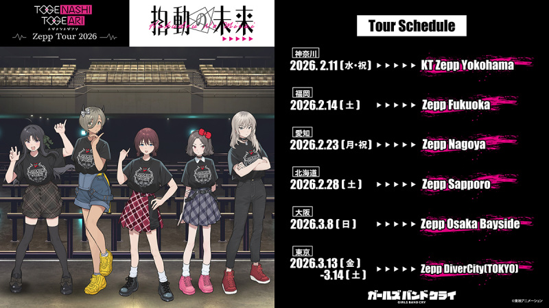 TVアニメ「ガールズバンドクライ」劇中バンド・トゲナシトゲアリによるZeppツアー。2026年2月から3月にかけて全国6都市で開催されるワンマンライブツアーです。