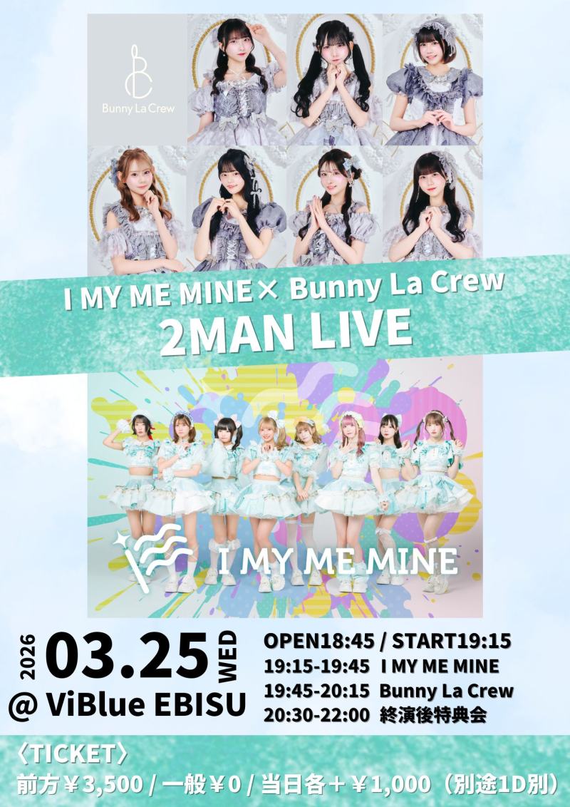 「I MY ME MINE×Bunny La Crew 2MAN LIVE」 会場:ViBlue EBISU 料金:前方3500円 一般無料 ※当日券+¥1,000 OPEN18:45 START19:15 19:15-19:45 I MY ME MINE 19:45-20:15 Bunny La Crew 20:30-22:00 特典会